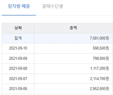 매출 : 7,581,000원(일 최대 매출 2,952,600원)